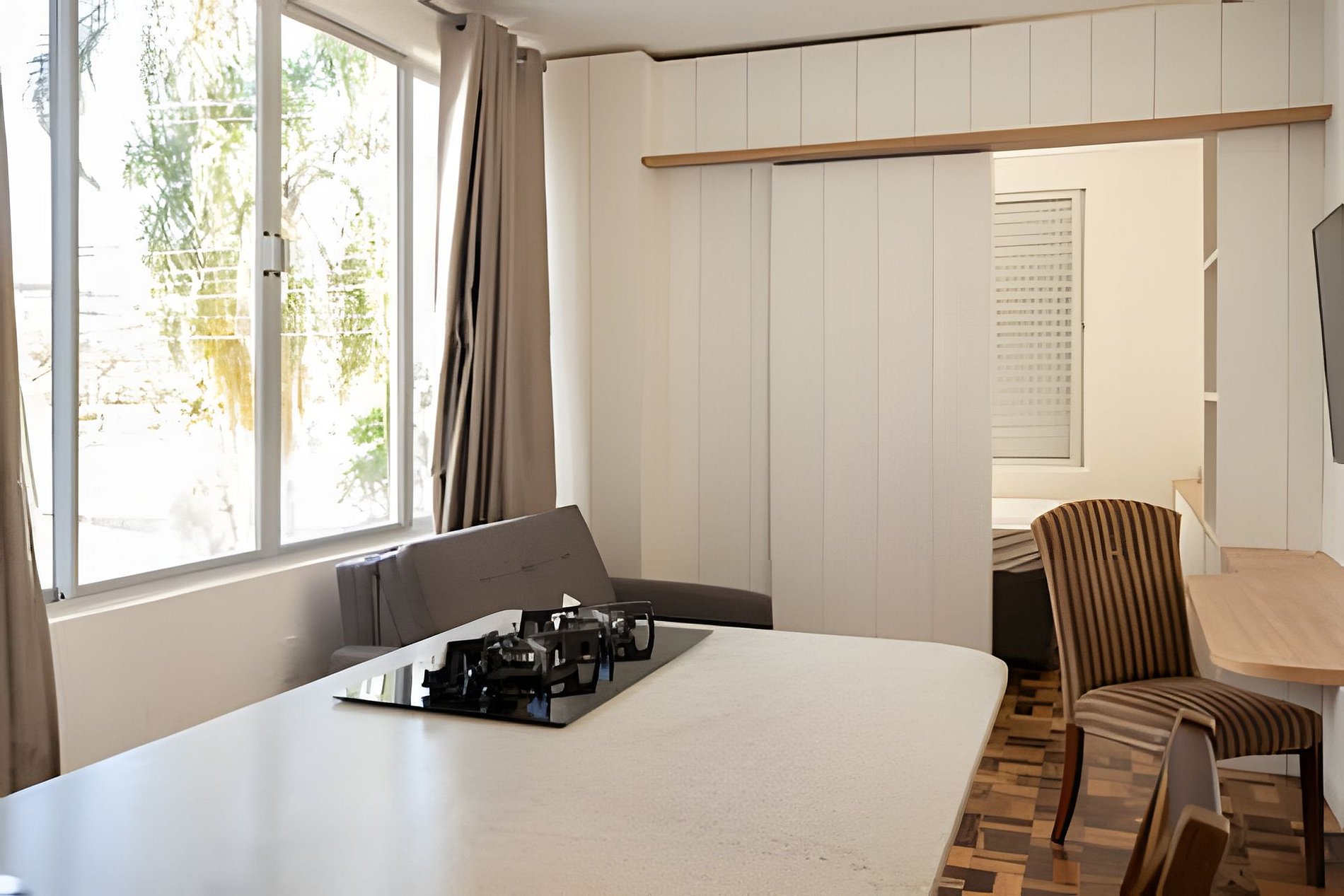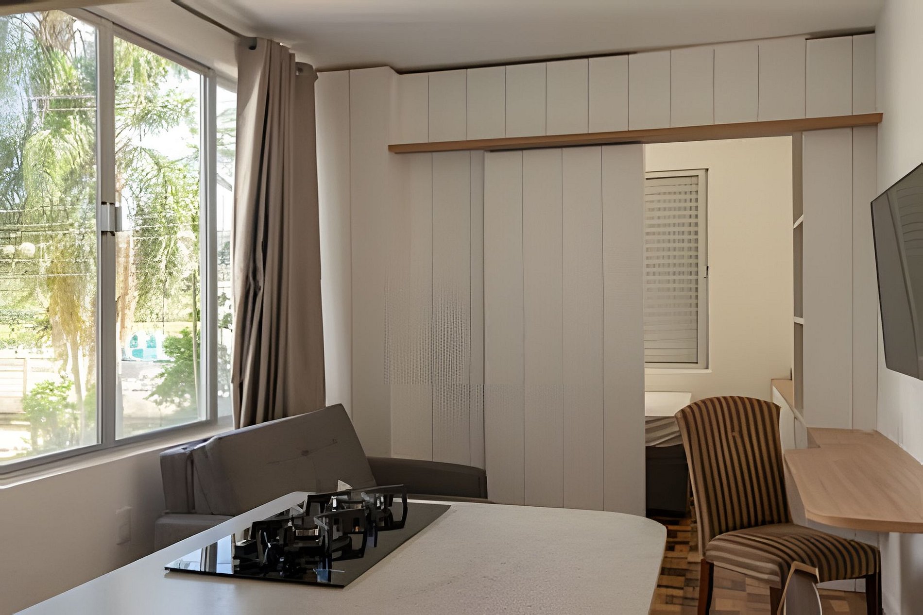 Planta inteligente com 3 ambientes distintos: quarto fechado com cama de casal, sala integrada à cozinha e banheiro espaçoso. Totalmente reformado com design moderno, marcenaria planejada e iluminação estratégica que valoriza cada detalhe.