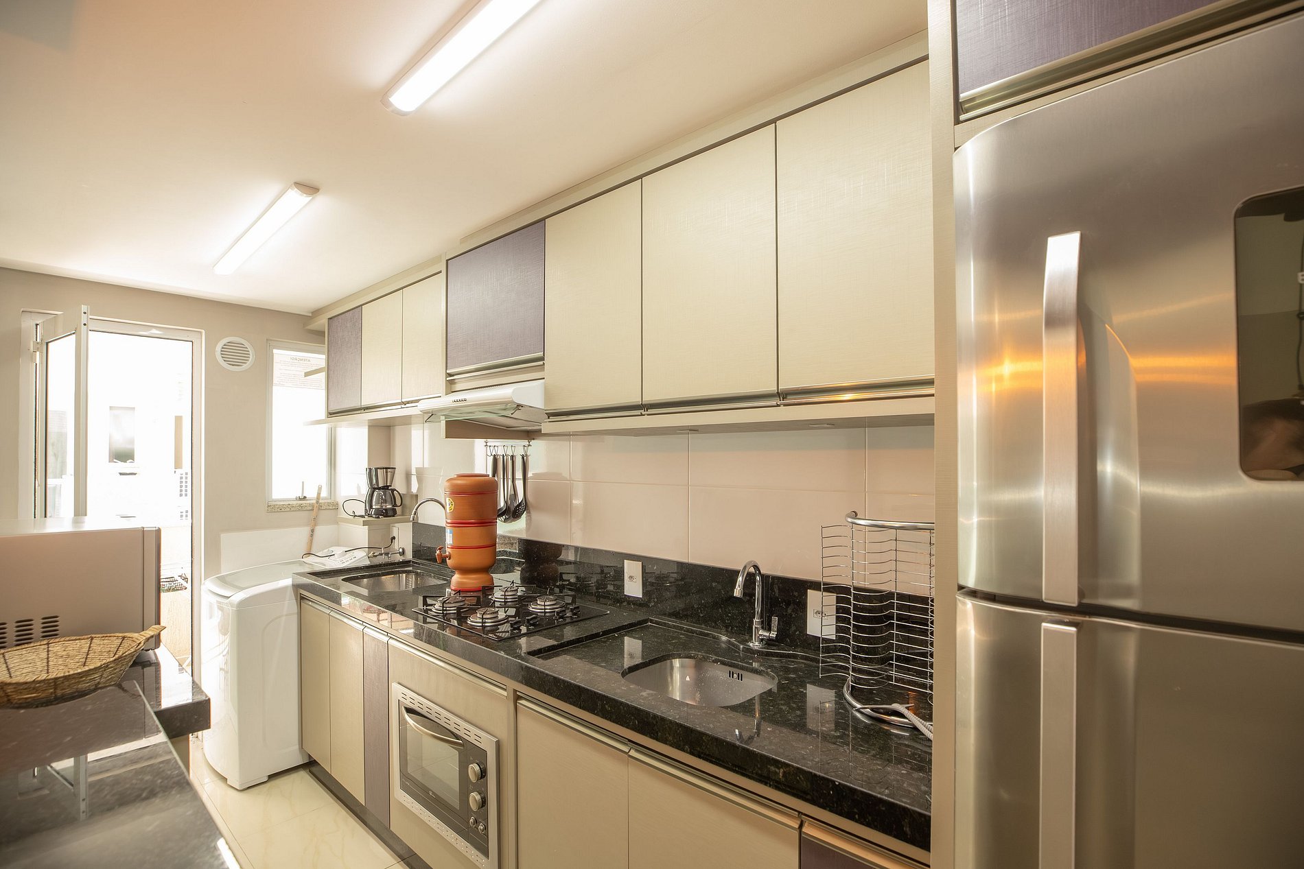 - Cozinha completa com geladeira, fogão cooktop, forno elétrico, micro-ondas, sanduicheira, liquidificador, panelas, louças e utensílios;