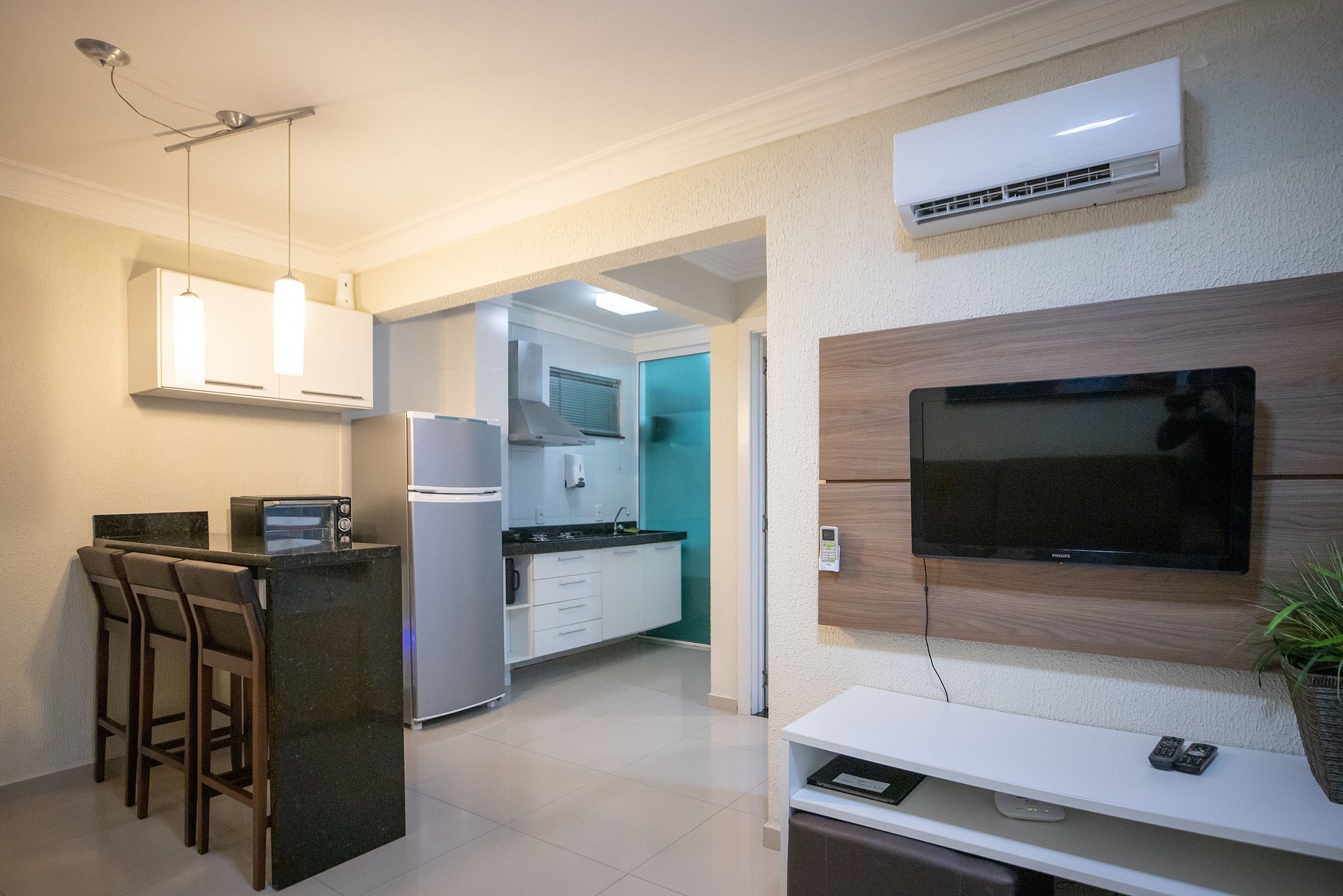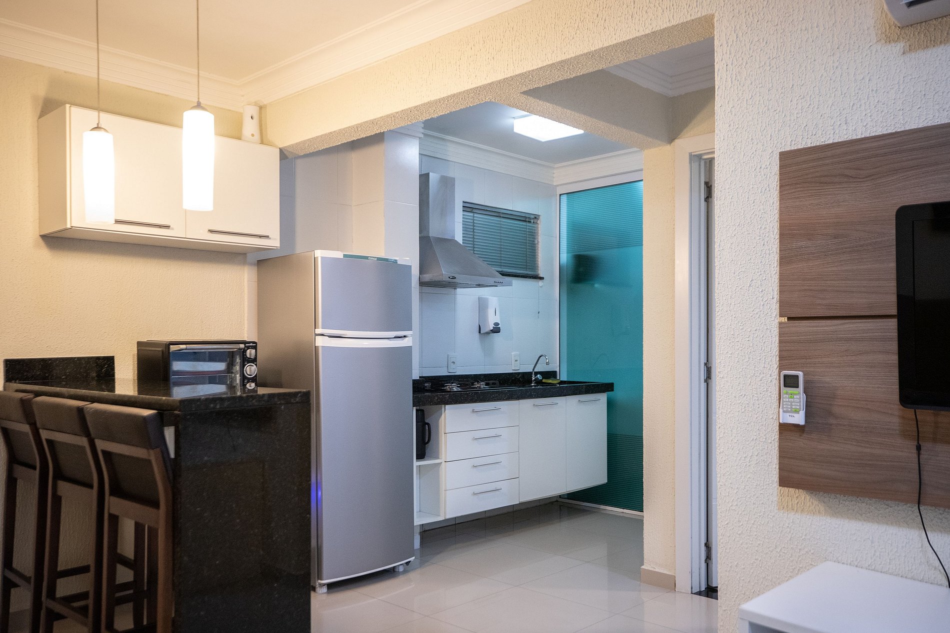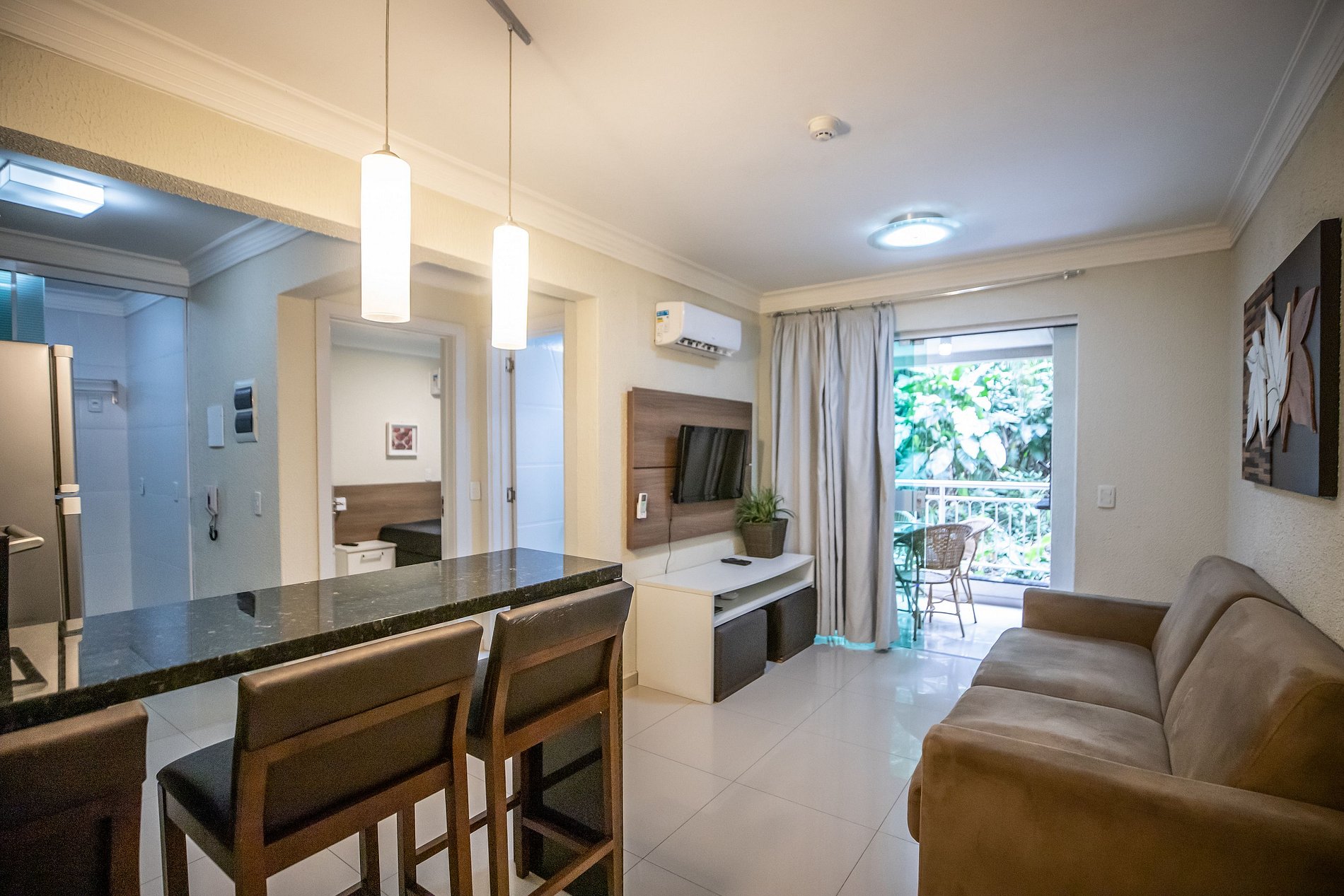 Adoramos! O apartamento é agradável e as piscinas e mesa de sinuca são d +! Choveu todos os dias, mas a piscina aquecida nos salvou... O comércio da praia de Bombas é uma graça!