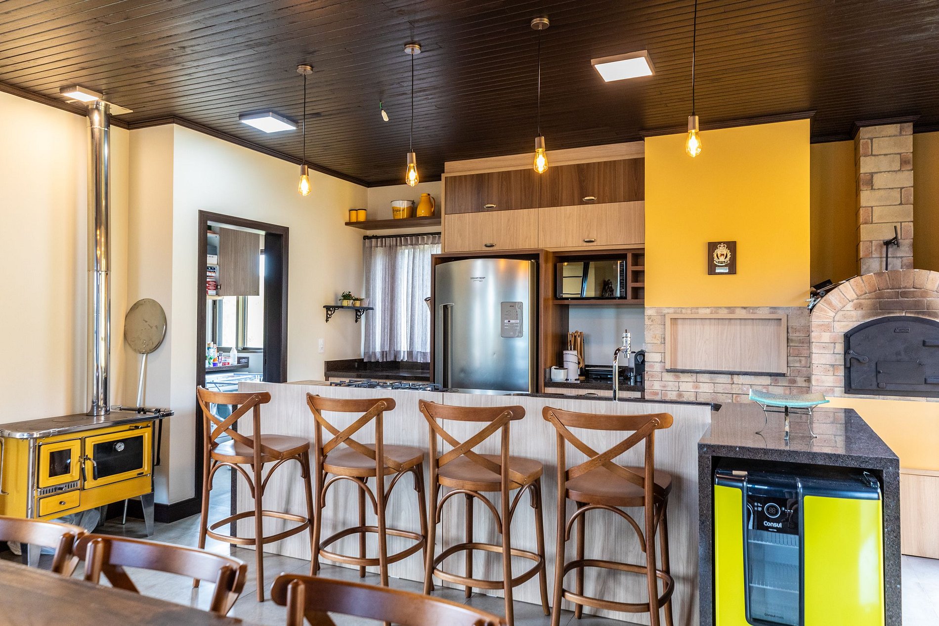 Cozinha completa com cooktop, forno elétrico, micro-ondas, refrigerador, cervejeira, pia com área gourmet, e bancada para refeições.