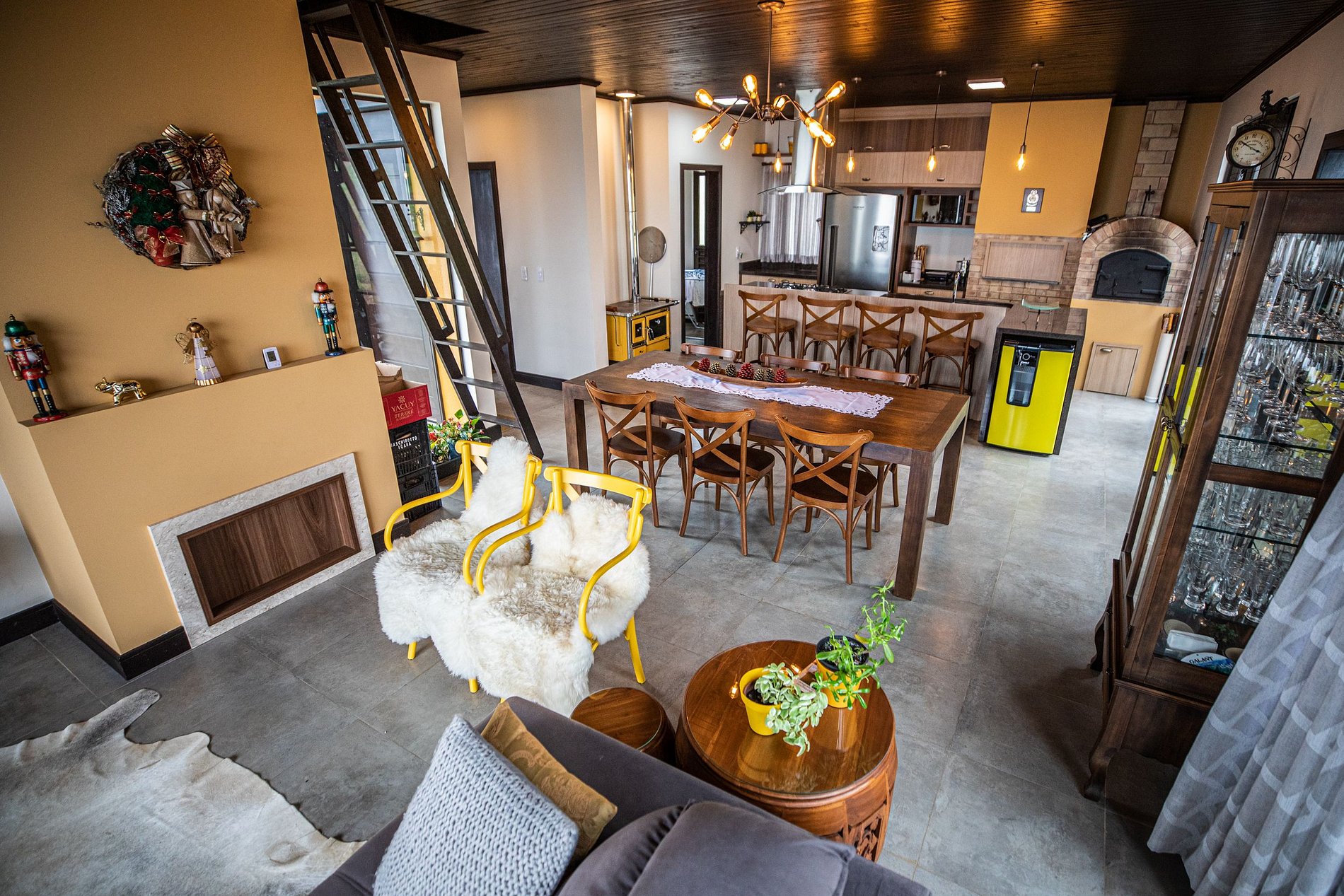 A casa Recanto das Carpas é uma casa de campo completa e sofisticada. Sala integrada com cozinha e mezanino, aprox. 140m2 de área útil construída (com varanda).