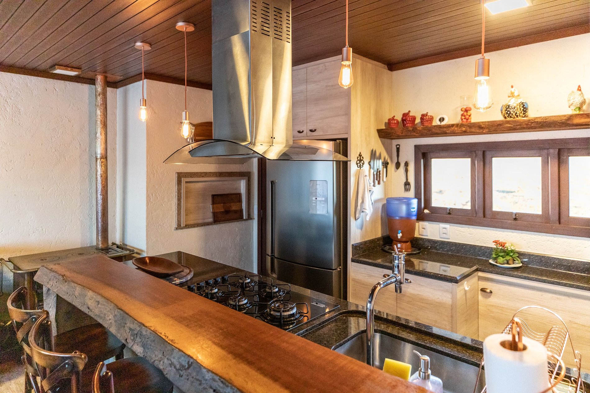 Na cozinha principal tem lava-louça, geladeria brastemp Maxi de 570L, cafeteira Nespresso, churrasqueira, fogão a lenha e muitos itensílios para comodidade de sua estadia.