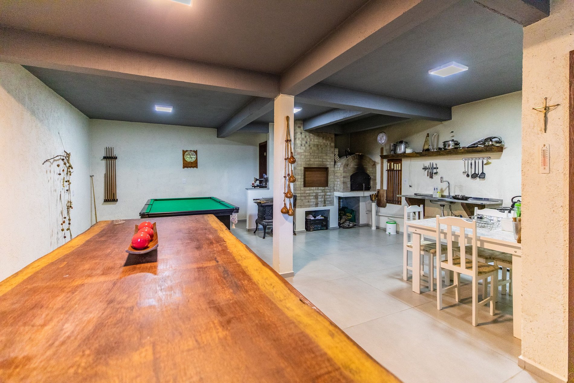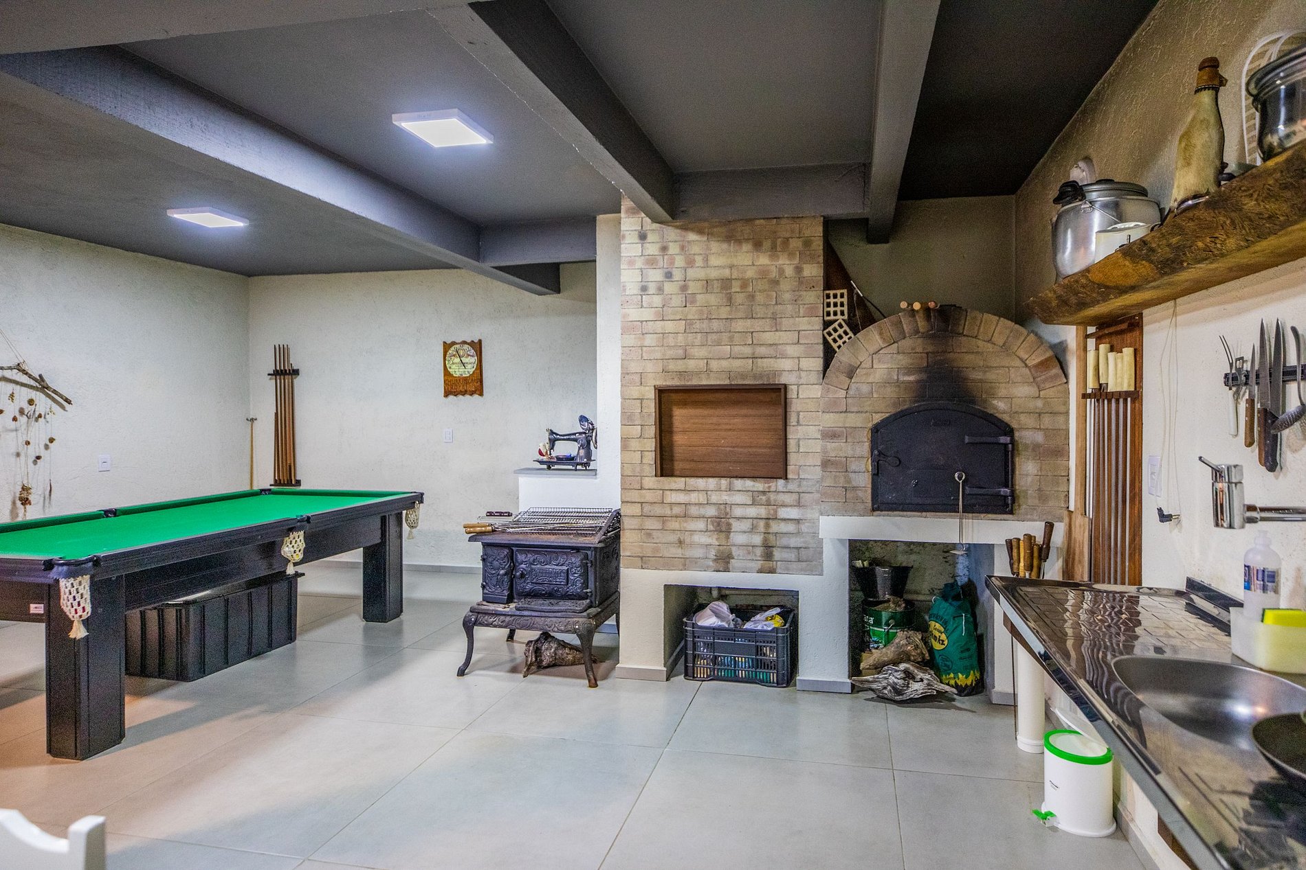 Em nosso térreo há garagem coberta para 2 carros. A direita temos uma suite ampla com Ar Condicionado para aquecer o ambiente e no lado esquerdo temos um ambiente de convivencia/festas, com uma mesa ampla, churrasqueira, fogão a lenha de ferro fundido, e uma cozinha completa, um pouco mais simples, uma mesa de sinuca também complementa esse espaço.